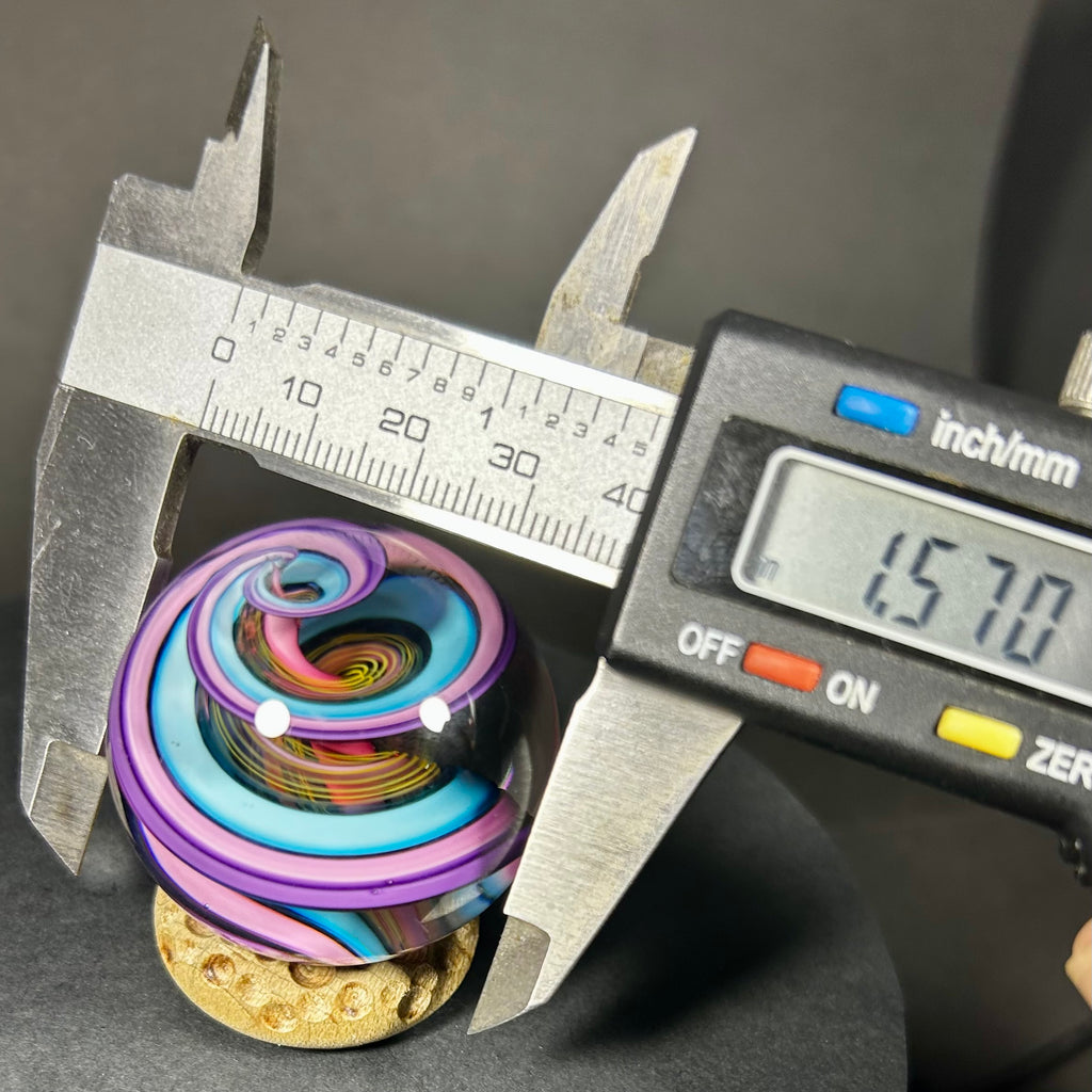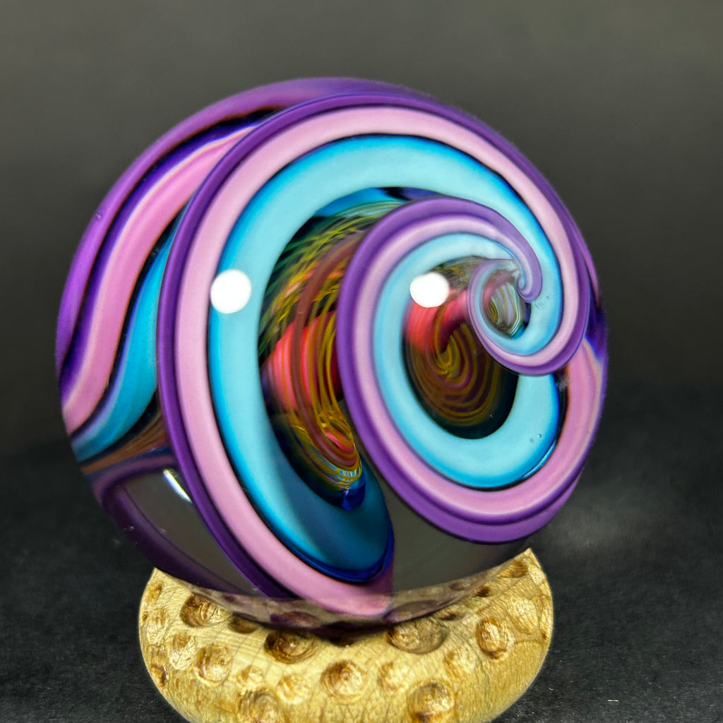 Geoffrey Beetem Art Glass Marble, pink core, fine line and large bands of neon blue and pink