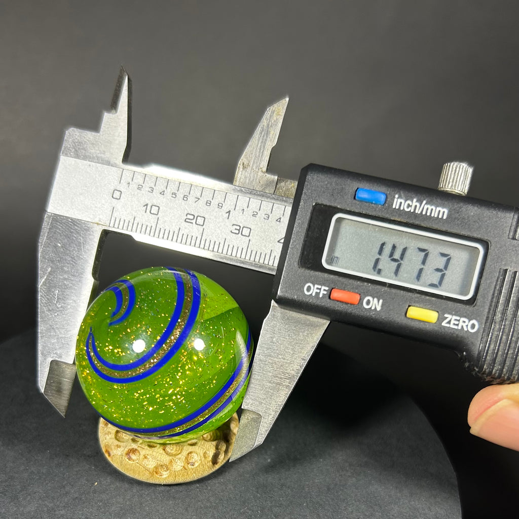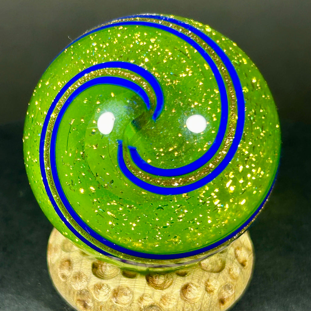 Geoffrey Beetem Art Glass Marble, Neon color bomb in Dichro yellow-green with bands 1.47”
